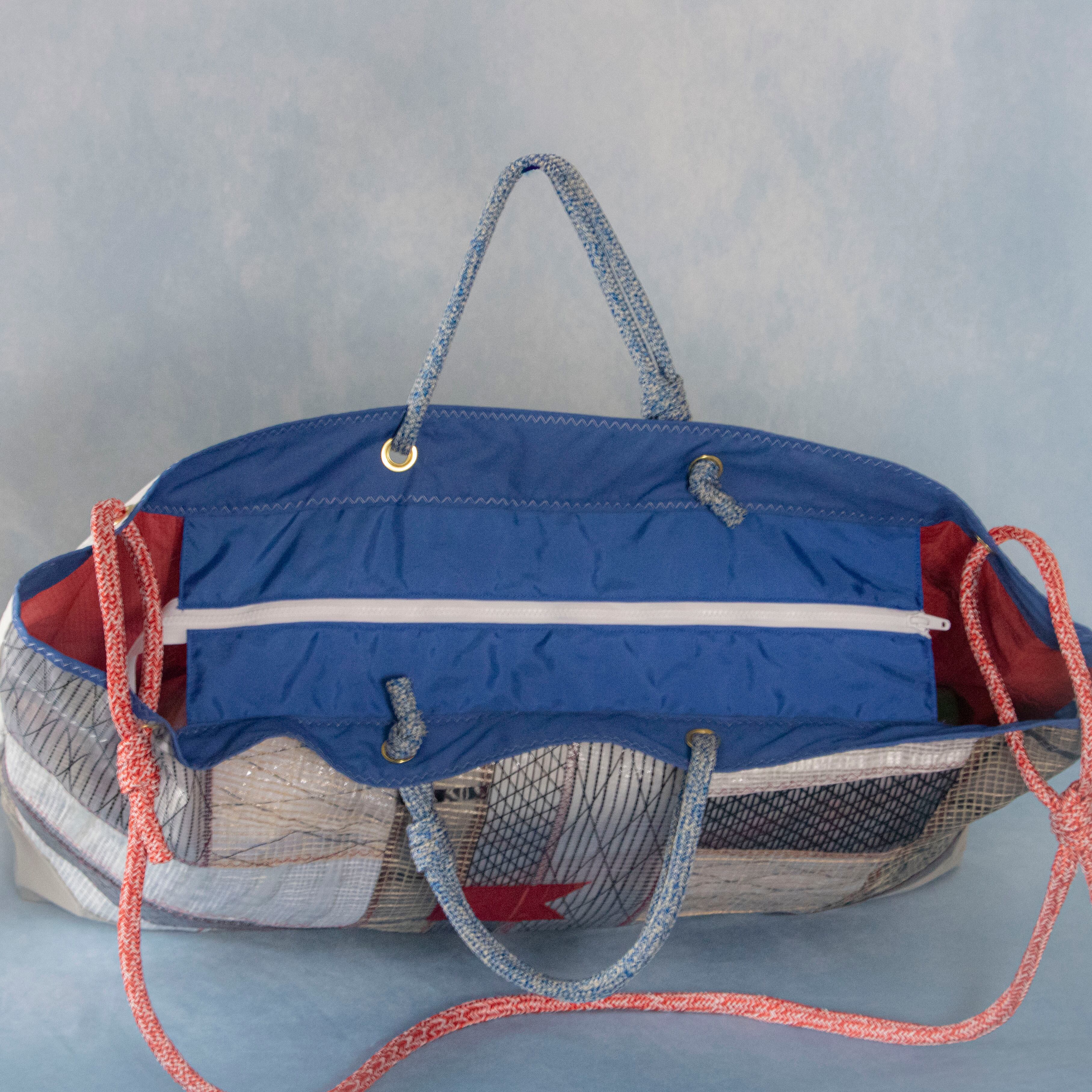 海を旅して、使い終わったヨットのセイルと、セイル製作時に出る新品の端材を組み合わせて作られた、唯一無二のアイテムです。海を旅した素材たちが、新たな命を吹き込まれ、個性豊かなデザインで、また旅をするように仕上げました。