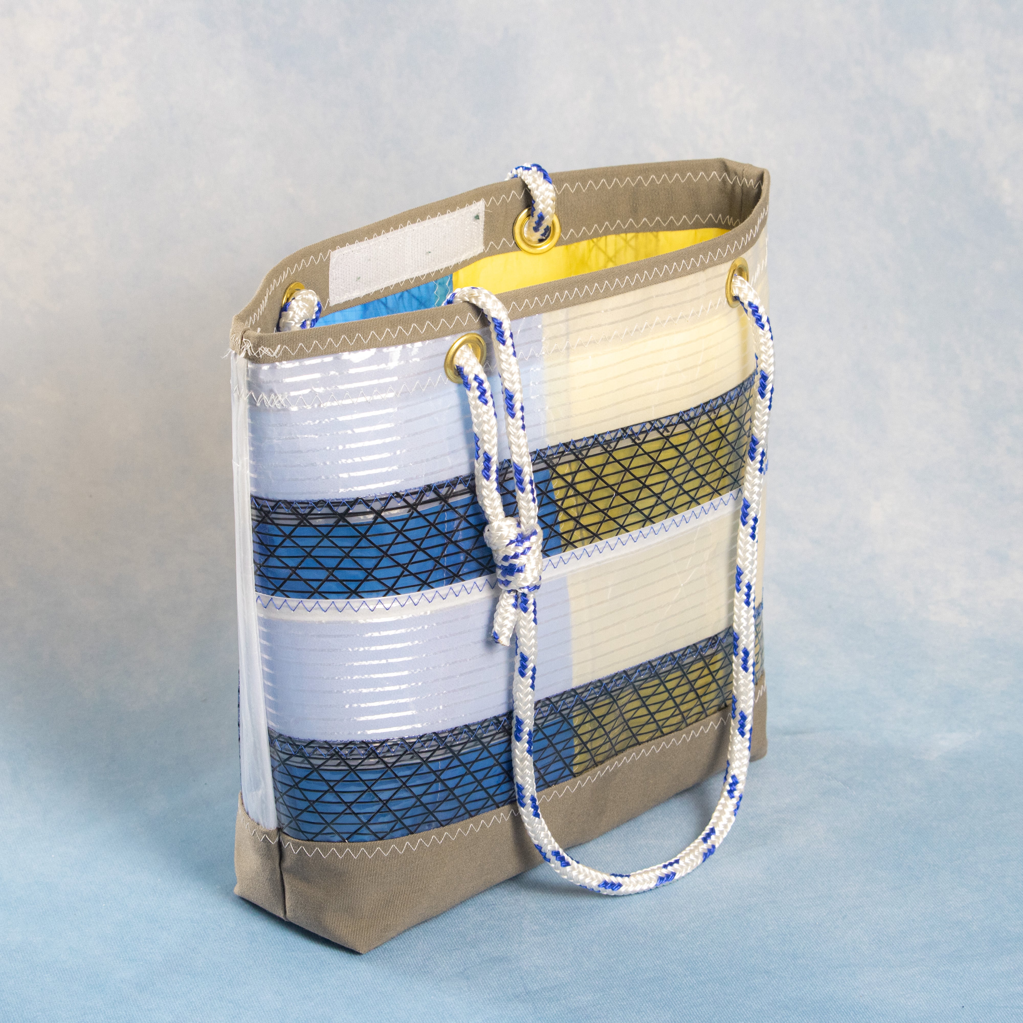 海を旅して、使い終わったヨットのセイルと、セイル製作時に出る新品の端材を組み合わせて作られた、唯一無二のアイテムです。海を旅した素材たちが、新たな命を吹き込まれ、個性豊かなデザインで、また旅をするように仕上げました。