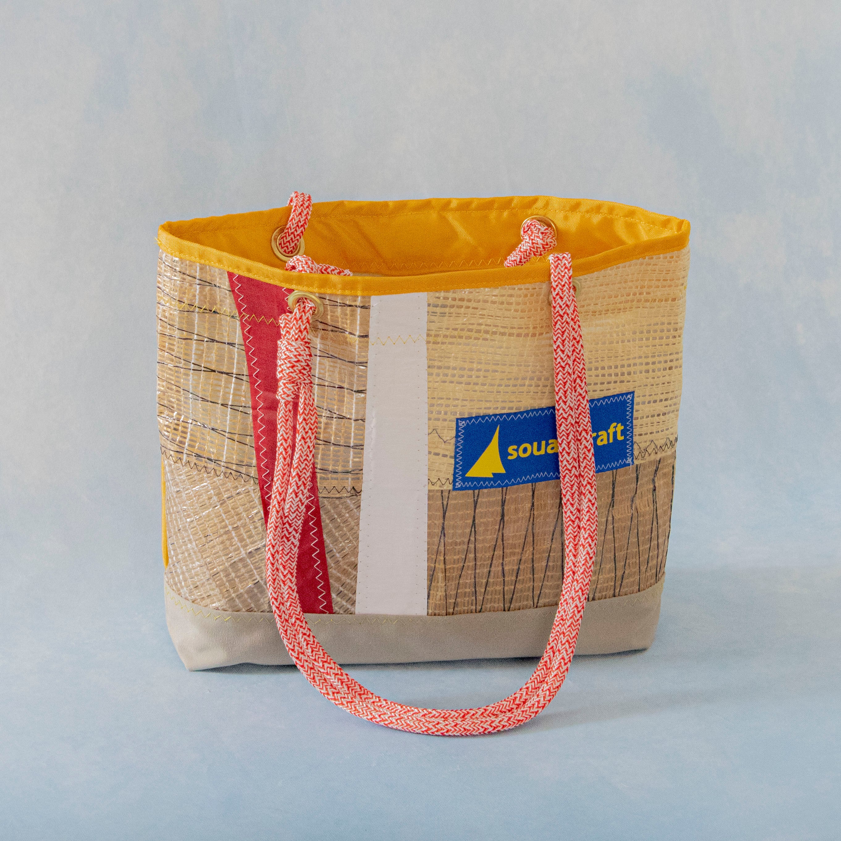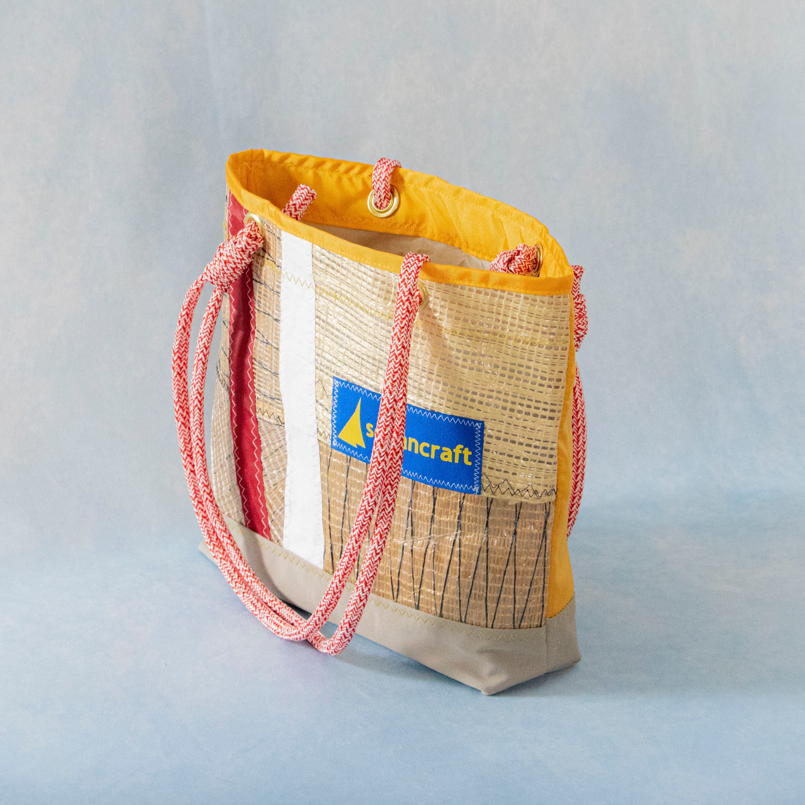 海を旅して、使い終わったヨットのセイルと、セイル製作時に出る新品の端材を組み合わせて作られた、唯一無二のアイテムです。海を旅した素材たちが、新たな命を吹き込まれ、個性豊かなデザインで、また旅をするように仕上げました。