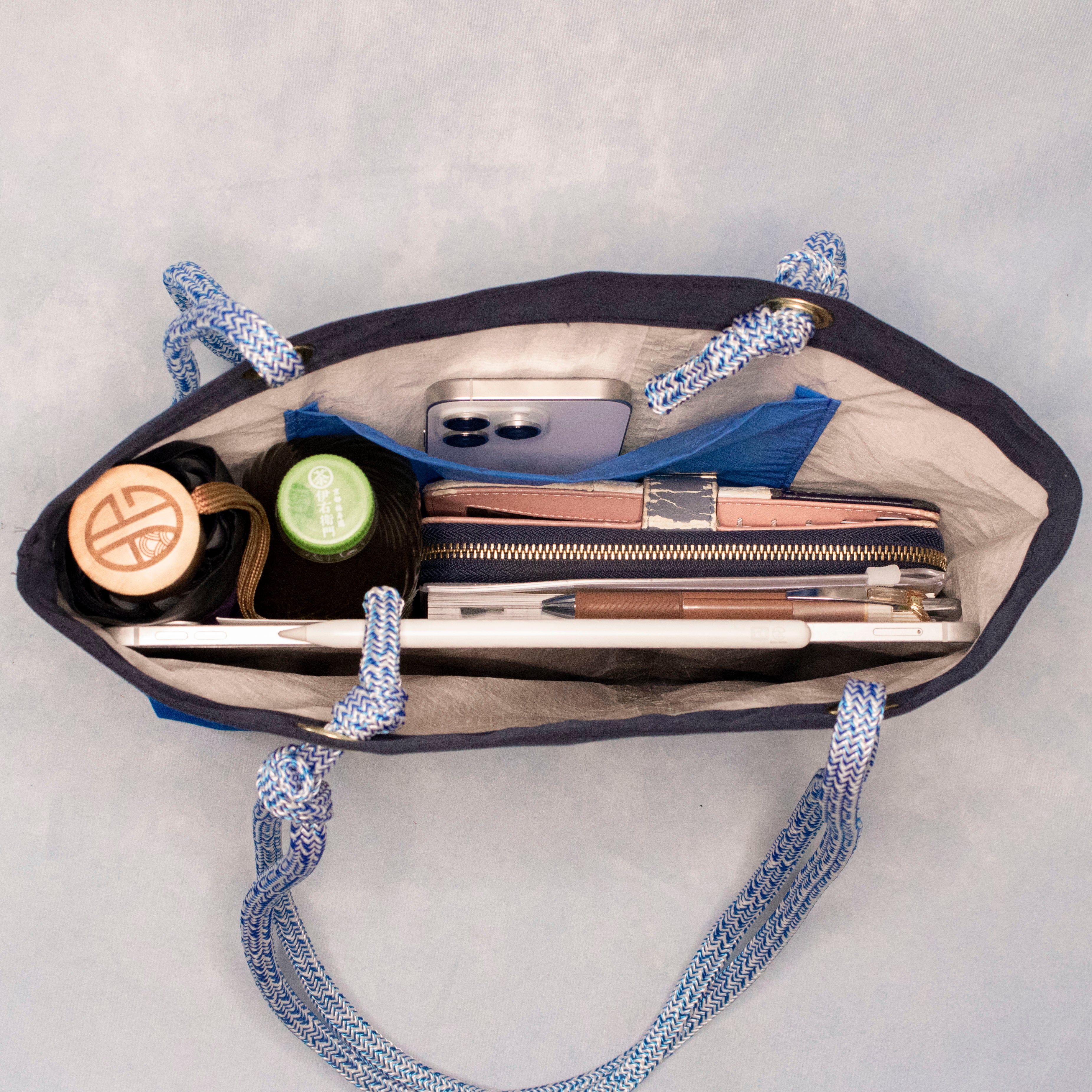 袋口とマチ付きの底の部分には、耐久性と耐候性に優れた「サンブレラ」生地を使用。日常使いにも安心の強度を確保しています。また、使用しているセイル生地は重さを感じない軽さです。組み合わせている生地は軽くて丈夫なカーボン、強靭なケブラー、柔らかなダクロンのセイル。